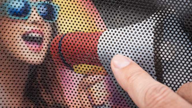 El vinil microperforado es un material adhesivo diseñado especialmente para superficies de vidrio. Tiene miles de pequeños orificios que permiten: